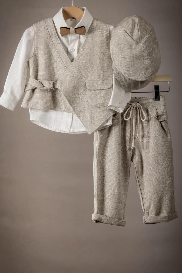 Ένα κομψό κουστούμι βάπτισης για τον μικρό σας άγγελο φτιαγμένο με άριστης ποιότητας υφάσματα, ιδανικό για την ευαίσθητη επιδερμίδα του μωρού σας, εξασφαλίζοντας άνεση και στυλ για την ξεχωριστή αυτή ημέρα. Παντελόνι: Κατασκευασμένο από απαλή βαμβακερή καμπαρτίνα. Το παντελόνι έχει άνετη γραμμή και διαθέτει λάστιχο στη μέση για τέλεια εφαρμογή. Γιλέκο και Πουκάμισο: Φτιαγμένα από άριστης ποιότητας 100% βαμβάκι