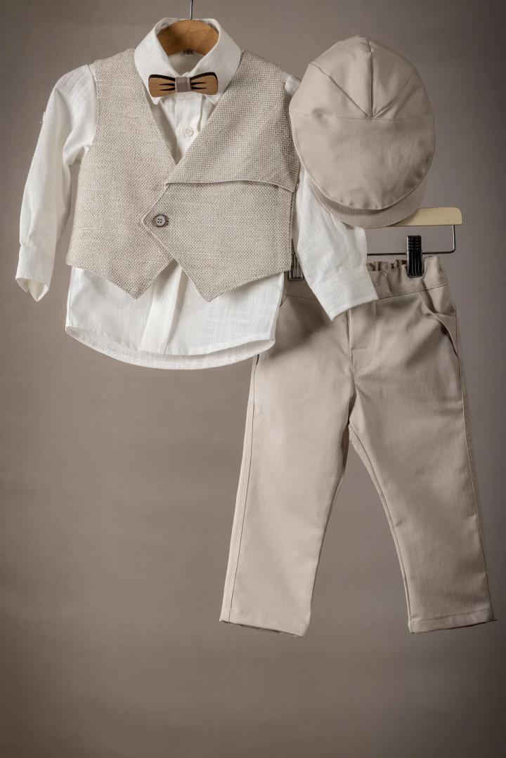 Ένα κομψό κουστούμι βάπτισης για τον μικρό σας άγγελο φτιαγμένο με άριστης ποιότητας υφάσματα, ιδανικό για την ευαίσθητη επιδερμίδα του μωρού σας, εξασφαλίζοντας άνεση και στυλ για την ξεχωριστή αυτή ημέρα. Παντελόνι: Κατασκευασμένο από απαλή βαμβακερή καμπαρτίνα. Το παντελόνι έχει άνετη γραμμή και διαθέτει λάστιχο στη μέση για τέλεια εφαρμογή. Γιλέκο και Πουκάμισο: Φτιαγμένα από άριστης ποιότητας 100% βαμβάκι