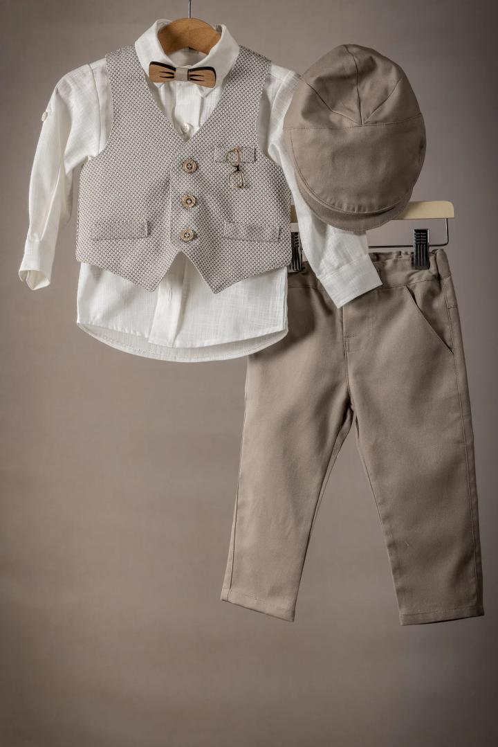 Ένα κομψό κουστούμι βάπτισης για τον μικρό σας άγγελο φτιαγμένο με άριστης ποιότητας υφάσματα, ιδανικό για την ευαίσθητη επιδερμίδα του μωρού σας, εξασφαλίζοντας άνεση και στυλ για την ξεχωριστή αυτή ημέρα. Παντελόνι: Κατασκευασμένο από απαλή βαμβακερή καμπαρτίνα. Το παντελόνι έχει άνετη γραμμή και διαθέτει λάστιχο στη μέση για τέλεια εφαρμογή. Γιλέκο και Πουκάμισο: Φτιαγμένα από άριστης ποιότητας 100% βαμβάκι
