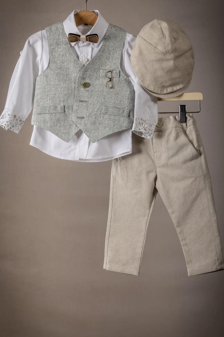 Ένα κομψό κουστούμι βάπτισης για τον μικρό σας άγγελο φτιαγμένο με άριστης ποιότητας υφάσματα, ιδανικό για την ευαίσθητη επιδερμίδα του μωρού σας, εξασφαλίζοντας άνεση και στυλ για την ξεχωριστή αυτή ημέρα. Παντελόνι: Κατασκευασμένο από απαλή βαμβακερή καμπαρτίνα. Το παντελόνι έχει άνετη γραμμή και διαθέτει λάστιχο στη μέση για τέλεια εφαρμογή. Γιλέκο και Πουκάμισο: Φτιαγμένα από άριστης ποιότητας 100% βαμβάκι