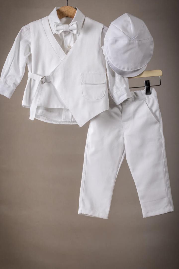 Ένα κομψό κουστούμι βάπτισης για τον μικρό σας άγγελο φτιαγμένο με άριστης ποιότητας υφάσματα, ιδανικό για την ευαίσθητη επιδερμίδα του μωρού σας, εξασφαλίζοντας άνεση και στυλ για την ξεχωριστή αυτή ημέρα. Παντελόνι: Κατασκευασμένο από απαλή βαμβακερή καμπαρτίνα. Το παντελόνι έχει άνετη γραμμή και διαθέτει λάστιχο στη μέση για τέλεια εφαρμογή. Γιλέκο και Πουκάμισο: Φτιαγμένα από άριστης ποιότητας 100% βαμβάκι