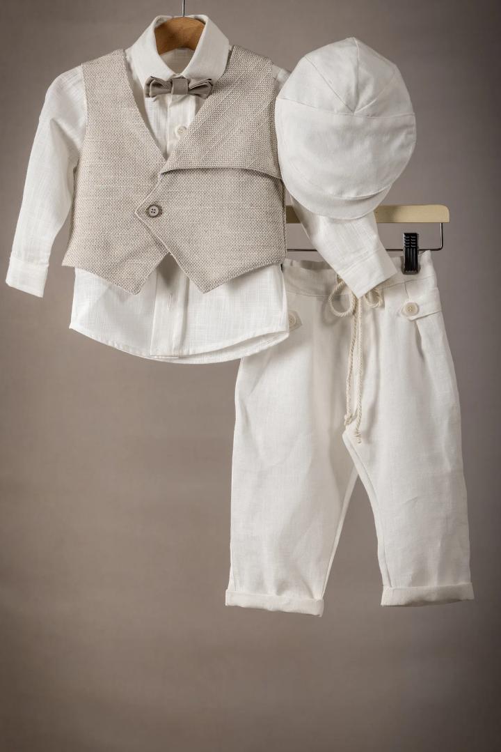 Ένα κομψό κουστούμι βάπτισης για τον μικρό σας άγγελο φτιαγμένο με άριστης ποιότητας υφάσματα, ιδανικό για την ευαίσθητη επιδερμίδα του μωρού σας, εξασφαλίζοντας άνεση και στυλ για την ξεχωριστή αυτή ημέρα. Παντελόνι: Κατασκευασμένο από απαλή βαμβακερή καμπαρτίνα. Το παντελόνι έχει άνετη γραμμή και διαθέτει λάστιχο στη μέση για τέλεια εφαρμογή. Γιλέκο και Πουκάμισο: Φτιαγμένα από άριστης ποιότητας 100% βαμβάκι