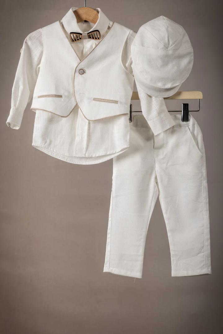 Ένα κομψό κουστούμι βάπτισης για τον μικρό σας άγγελο φτιαγμένο με άριστης ποιότητας υφάσματα, ιδανικό για την ευαίσθητη επιδερμίδα του μωρού σας, εξασφαλίζοντας άνεση και στυλ για την ξεχωριστή αυτή ημέρα. Παντελόνι: Κατασκευασμένο από απαλή βαμβακερή καμπαρτίνα. Το παντελόνι έχει άνετη γραμμή και διαθέτει λάστιχο στη μέση για τέλεια εφαρμογή. Γιλέκο και Πουκάμισο: Φτιαγμένα από άριστης ποιότητας 100% βαμβάκι