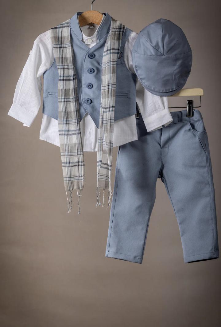 Ένα κομψό κουστούμι βάπτισης για τον μικρό σας άγγελο φτιαγμένο με άριστης ποιότητας υφάσματα, ιδανικό για την ευαίσθητη επιδερμίδα του μωρού σας, εξασφαλίζοντας άνεση και στυλ για την ξεχωριστή αυτή ημέρα. Παντελόνι: Κατασκευασμένο από απαλή βαμβακερή καμπαρτίνα. Το παντελόνι έχει άνετη γραμμή και διαθέτει λάστιχο στη μέση για τέλεια εφαρμογή. Γιλέκο και Πουκάμισο: Φτιαγμένα από άριστης ποιότητας 100% βαμβάκι