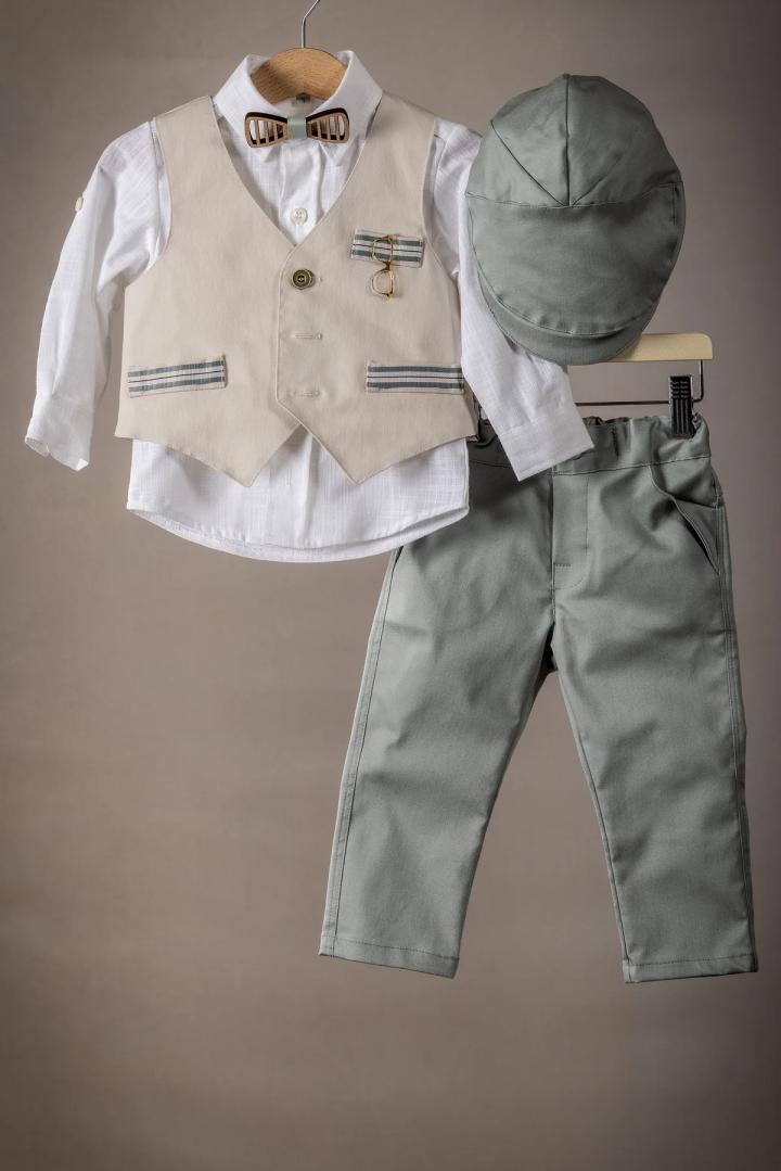 Ένα κομψό κουστούμι βάπτισης για τον μικρό σας άγγελο φτιαγμένο με άριστης ποιότητας υφάσματα, ιδανικό για την ευαίσθητη επιδερμίδα του μωρού σας, εξασφαλίζοντας άνεση και στυλ για την ξεχωριστή αυτή ημέρα. Παντελόνι: Κατασκευασμένο από απαλή βαμβακερή καμπαρτίνα. Το παντελόνι έχει άνετη γραμμή και διαθέτει λάστιχο στη μέση για τέλεια εφαρμογή. Γιλέκο και Πουκάμισο: Φτιαγμένα από άριστης ποιότητας 100% βαμβάκι