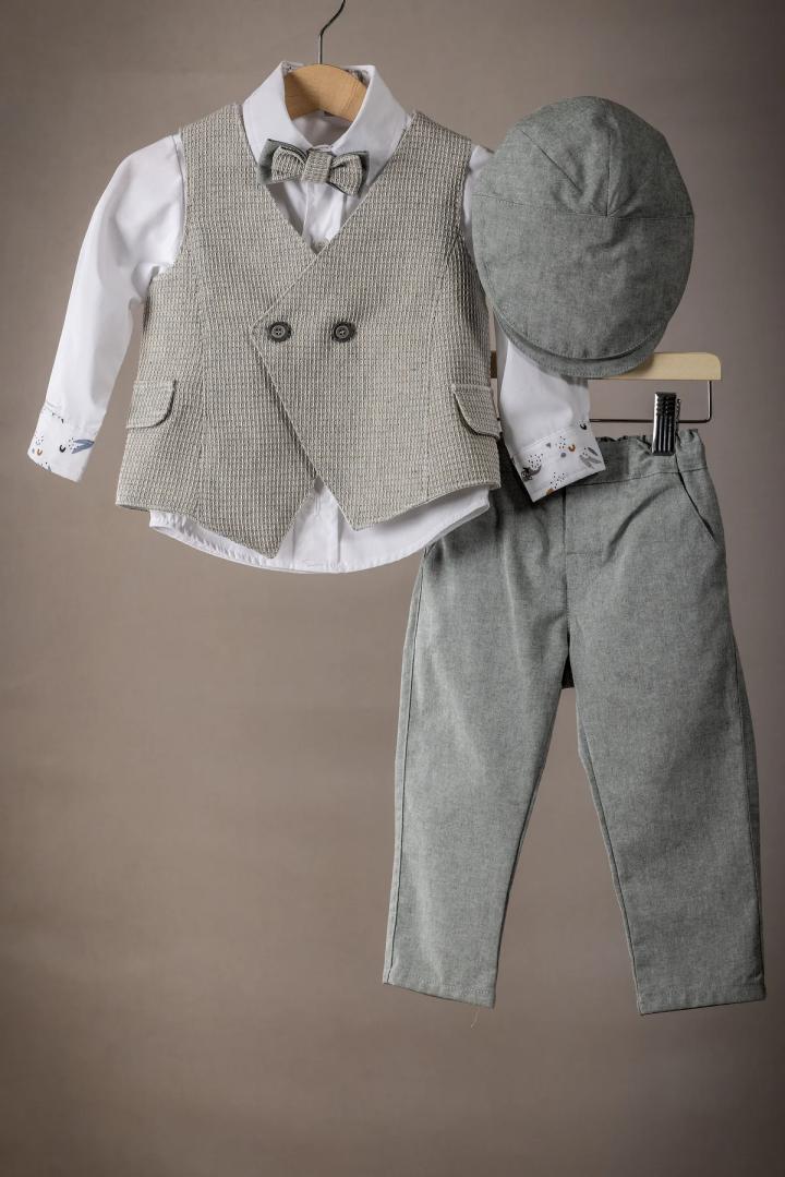 Ένα κομψό κουστούμι βάπτισης για τον μικρό σας άγγελο φτιαγμένο με άριστης ποιότητας υφάσματα, ιδανικό για την ευαίσθητη επιδερμίδα του μωρού σας, εξασφαλίζοντας άνεση και στυλ για την ξεχωριστή αυτή ημέρα. Παντελόνι: Κατασκευασμένο από απαλή βαμβακερή καμπαρτίνα. Το παντελόνι έχει άνετη γραμμή και διαθέτει λάστιχο στη μέση για τέλεια εφαρμογή. Γιλέκο και Πουκάμισο: Φτιαγμένα από άριστης ποιότητας 100% βαμβάκι