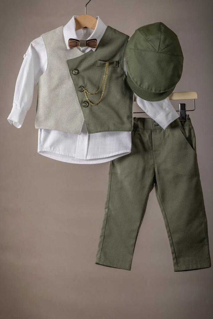 Ένα κομψό κουστούμι βάπτισης για τον μικρό σας άγγελο φτιαγμένο με άριστης ποιότητας υφάσματα, ιδανικό για την ευαίσθητη επιδερμίδα του μωρού σας, εξασφαλίζοντας άνεση και στυλ για την ξεχωριστή αυτή ημέρα. Παντελόνι: Κατασκευασμένο από ελαστική καμπαρτίνα. Το παντελόνι έχει άνετη γραμμή και διαθέτει λάστιχο στη μέση για τέλεια εφαρμογή. Γιλέκο και Πουκάμισο: Φτιαγμένα από άριστης ποιότητας 100% βαμβάκι