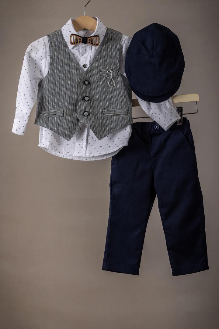 Ένα κομψό κουστούμι βάπτισης για τον μικρό σας άγγελο φτιαγμένο με άριστης ποιότητας υφάσματα, ιδανικό για την ευαίσθητη επιδερμίδα του μωρού σας, εξασφαλίζοντας άνεση και στυλ για την ξεχωριστή αυτή ημέρα. Παντελόνι: Κατασκευασμένο από απαλή βαμβακερή καμπαρτίνα. Το παντελόνι έχει άνετη γραμμή και διαθέτει λάστιχο στη μέση για τέλεια εφαρμογή. Γιλέκο και Πουκάμισο: Φτιαγμένα από άριστης ποιότητας 100% βαμβάκι