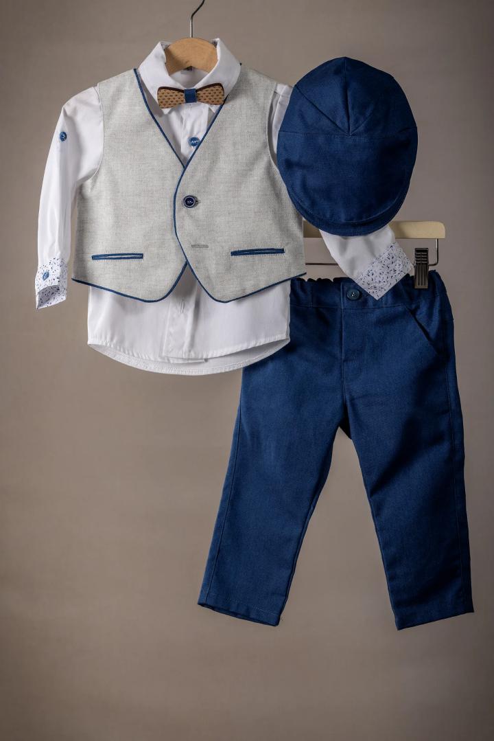 Ένα κομψό κουστούμι βάπτισης για τον μικρό σας άγγελο φτιαγμένο με άριστης ποιότητας υφάσματα, ιδανικό για την ευαίσθητη επιδερμίδα του μωρού σας, εξασφαλίζοντας άνεση και στυλ για την ξεχωριστή αυτή ημέρα. Παντελόνι: Κατασκευασμένο από απαλή βαμβακερή καμπαρτίνα. Το παντελόνι έχει άνετη γραμμή και διαθέτει λάστιχο στη μέση για τέλεια εφαρμογή. Γιλέκο και Πουκάμισο: Φτιαγμένα από άριστης ποιότητας 100% βαμβάκι