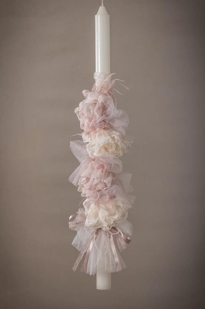 Φινετσάτη, πλούσια σε στολισμό λαμπάδα βάπτισης που συνδυάζεται άψογα με φορεματάκια της συλλογής μας. Διακοσμείται από χειροποίητα λουλούδια και τούλι σε χρωματισμούς που ταιριάζουν απόλυτα με το φορεματάκι που επιλέξατε.