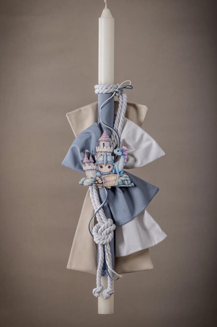 Μια εντυπωσιακή λαμπάδα βάπτισης, κατασκευασμένη από χειροποίητους φιόγκους δημιουργημένοι από τα ίδια υφάσματα που επιλέξατε για το κουστούμι του μωρού σας, δημιουργώντας ένα αρμονικό πακέτο που θα εντυπωσιάσει. Επιπλέον, σας δίνουμε τη δυνατότητα να επιλέξετε το θέμα που επιθυμείτε, εξατομικεύοντας έτσι τη λαμπάδα σύμφωνα με τις προτιμήσεις και το στυλ της βάπτισης σας.